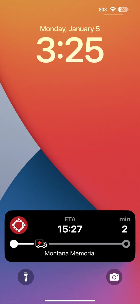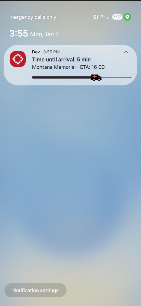 View the ETA, destination hospital, remaining time, and an animated ambulance timeline directly on your lock screen/notification drawer.