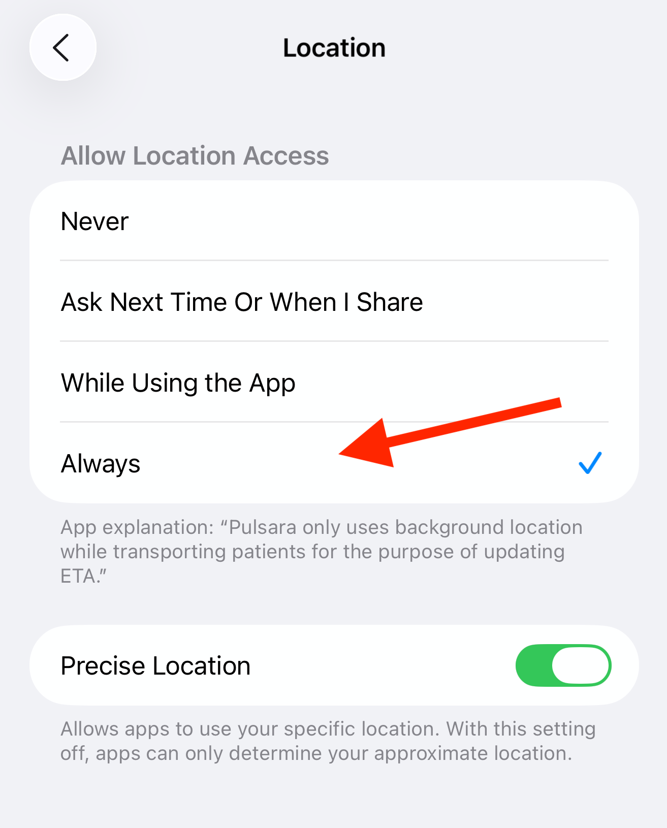 You will be navigated to the location settings for Pulsara in your device settings. Select the 'Always' location setting to ensure an accurate ETA.
