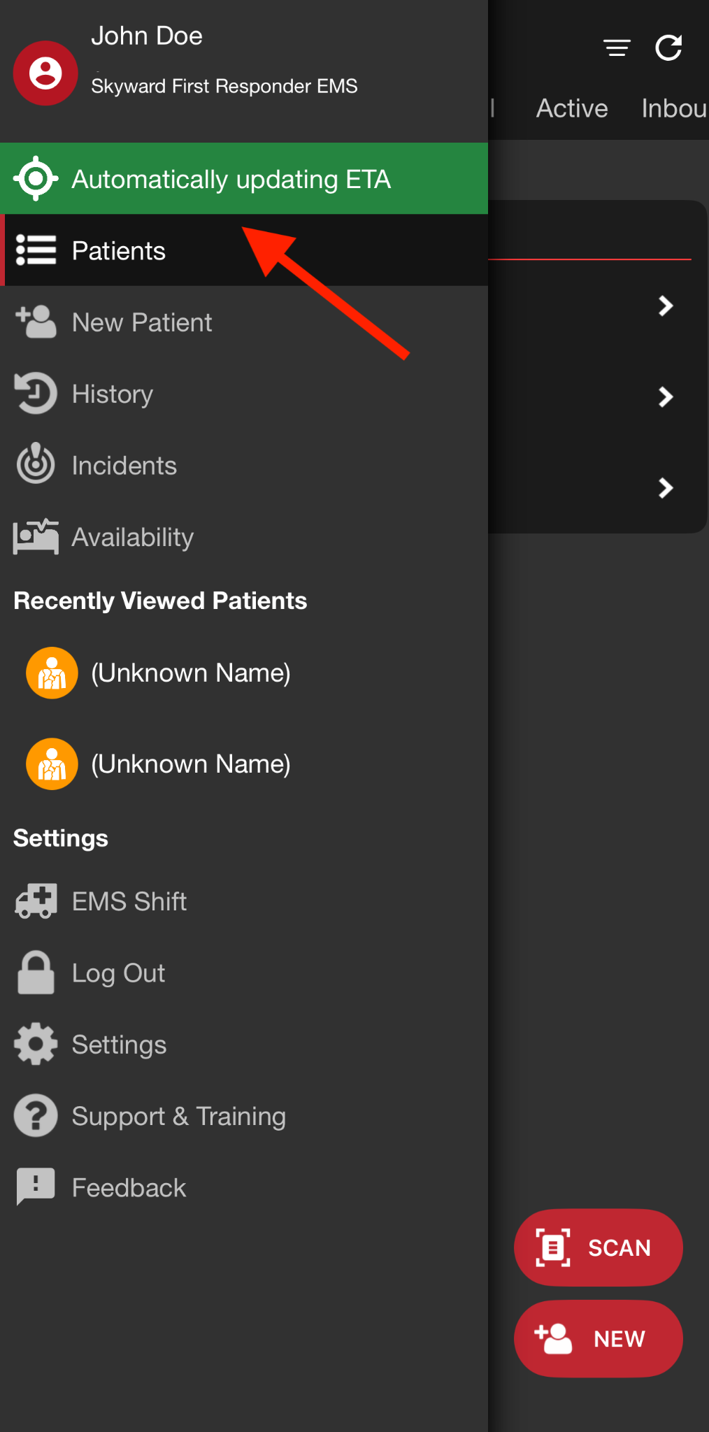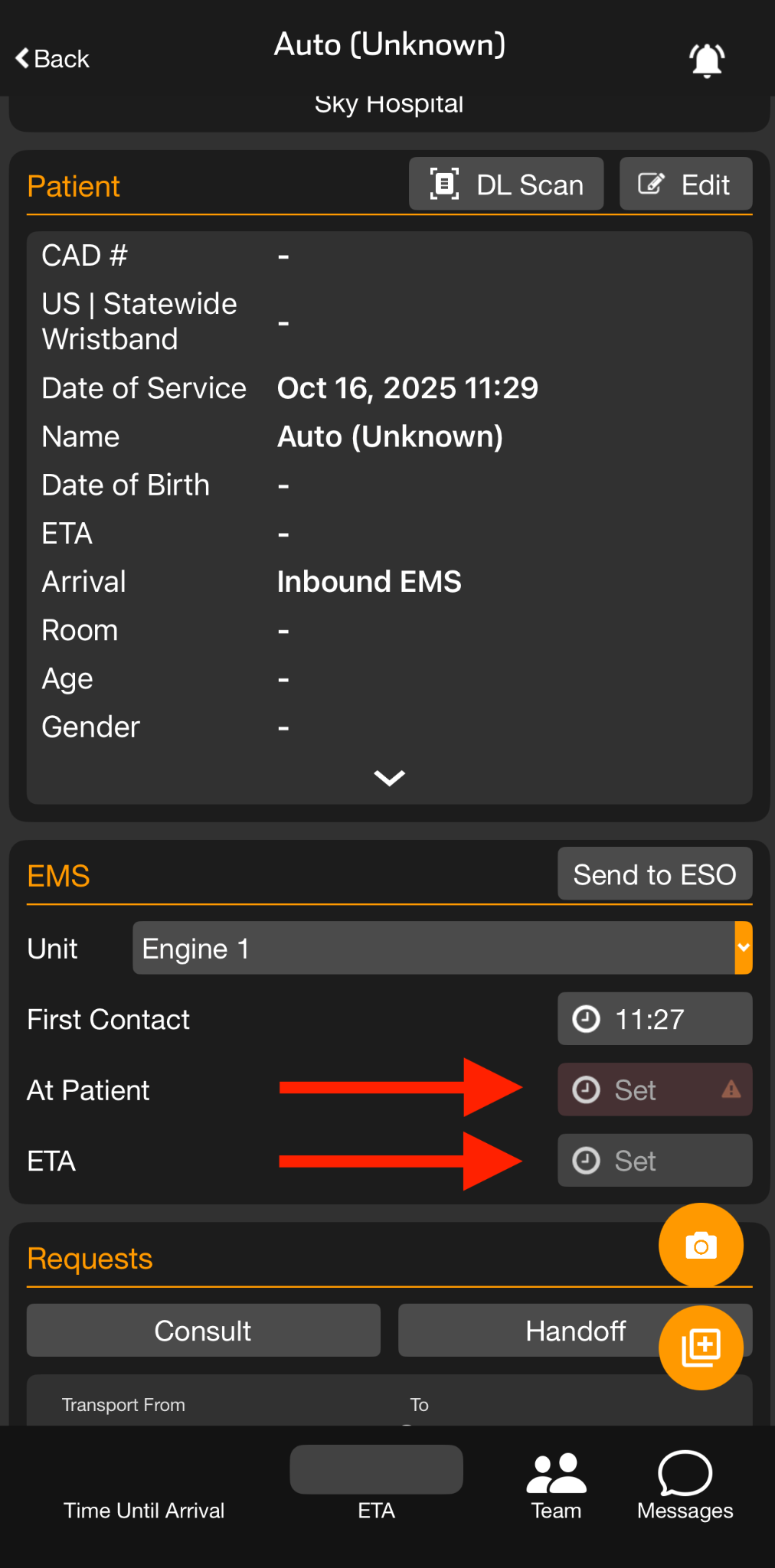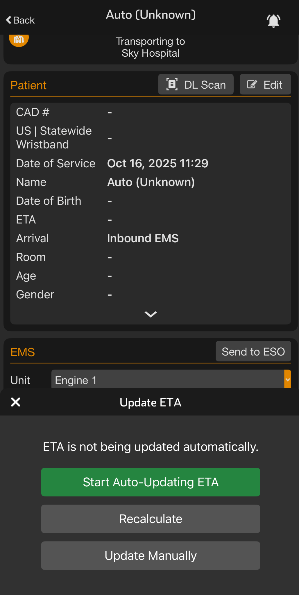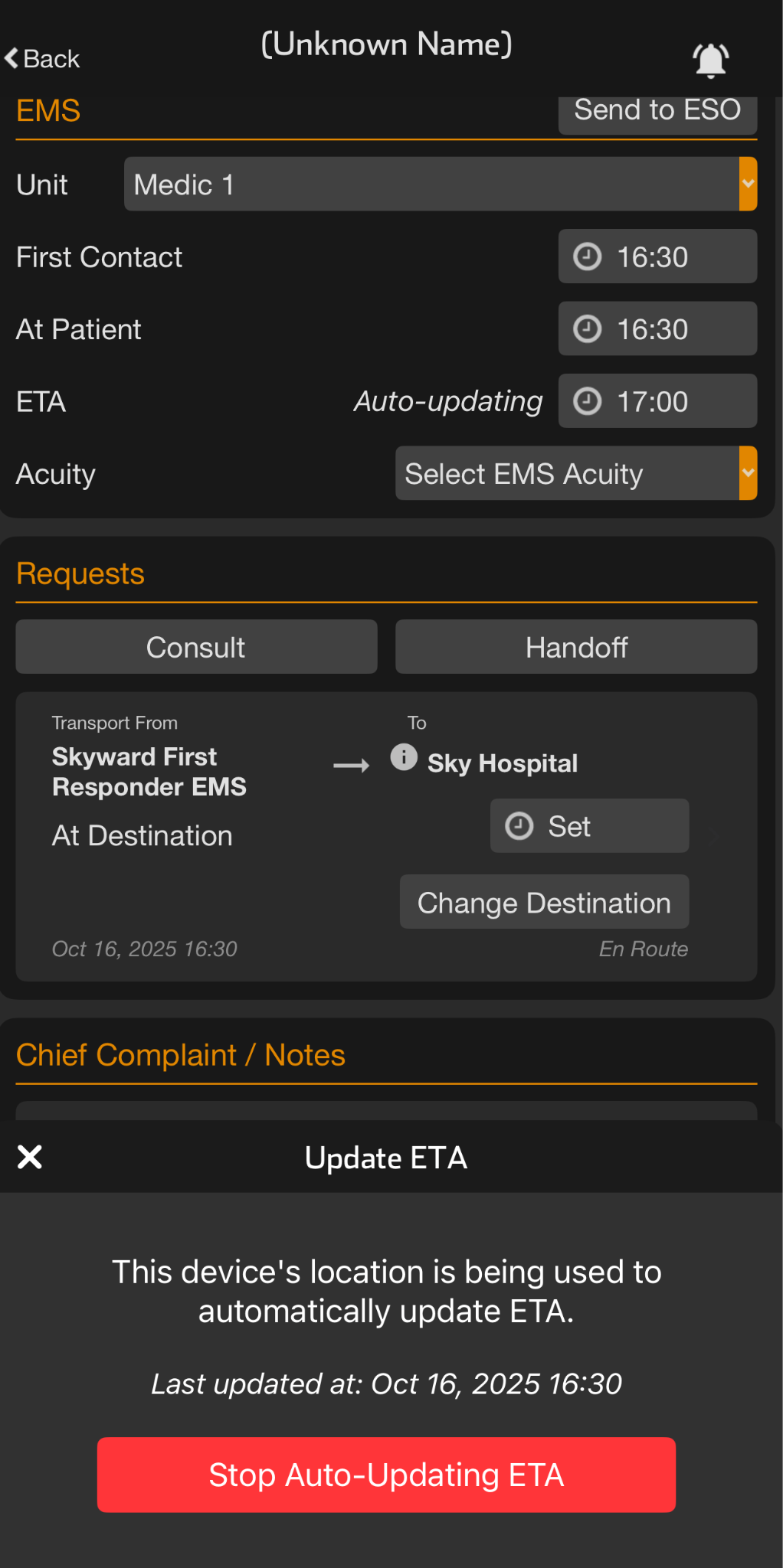 If a Handoff is performed to your unit/crew, set At Patient time and select ETA to begin automatically updating ETA.