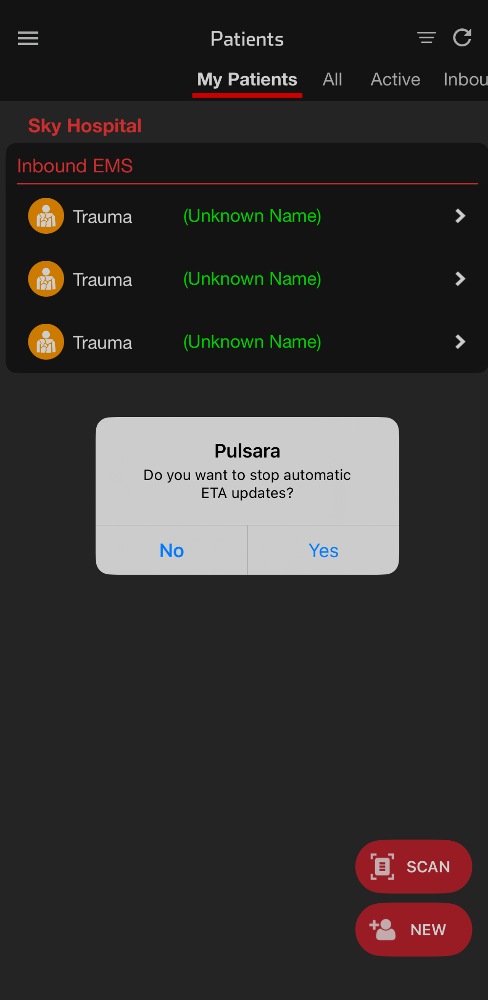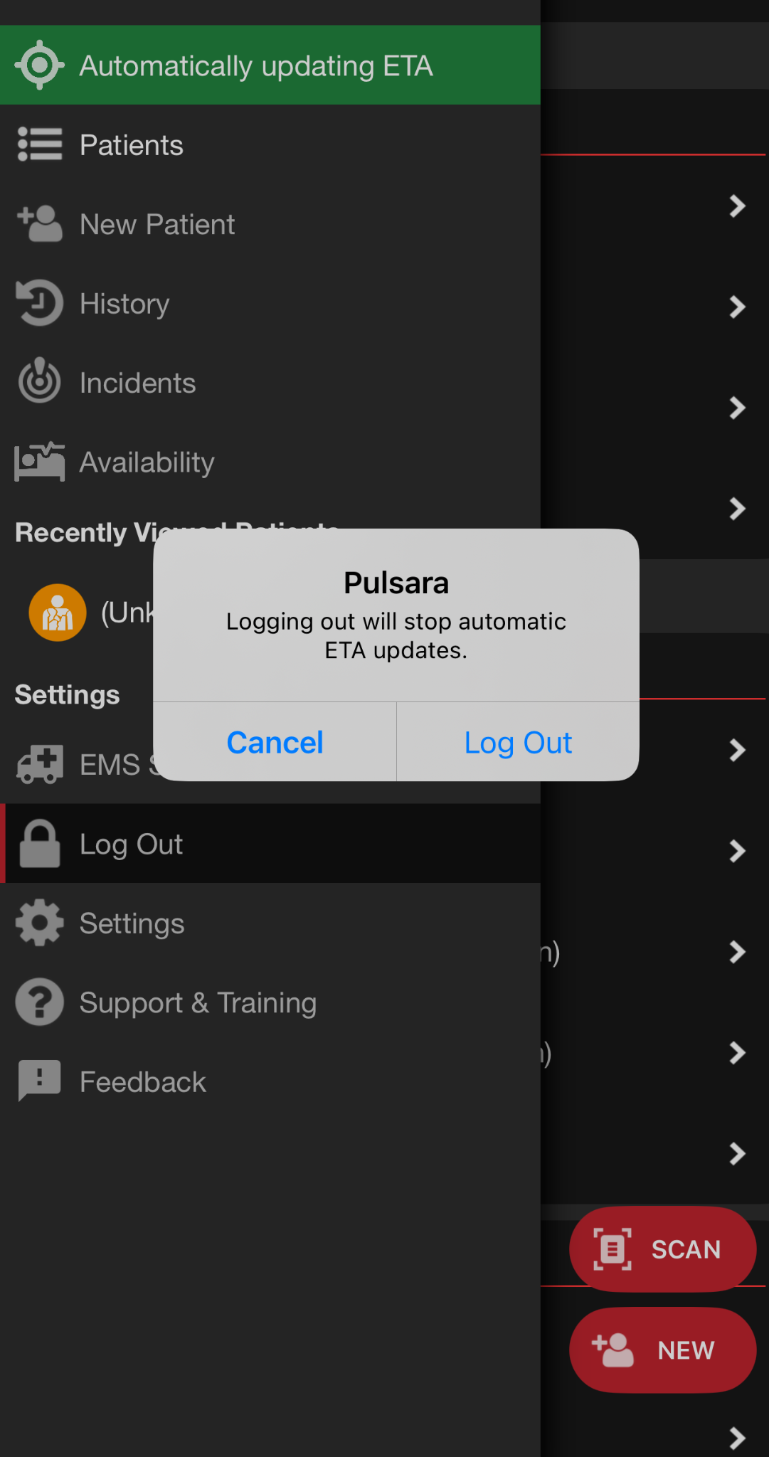 Logging out of Pulsara will stop automatic ETA Updates for all patients where Auto-ETA was enabled.