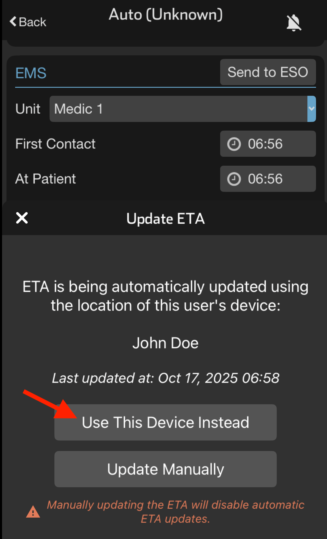 If multiple crew members and devices are on scene and on the patient channel, the device that is with the crew transporting the patient can be switched to continue Auto-updating ETA.