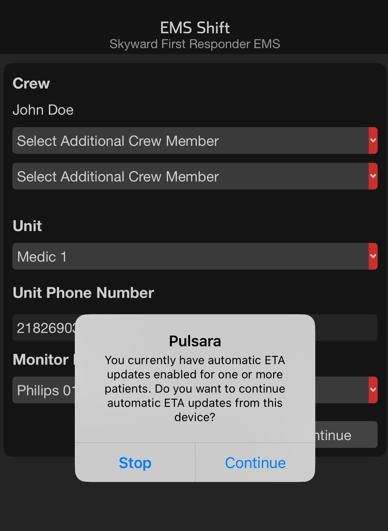 If your device is powered off and back on, if Pulsara is terminated, or if you have logged in on a new device, upon opening Pulsara again, you will be prompted to Stop or Continue with automatic ETA updates.