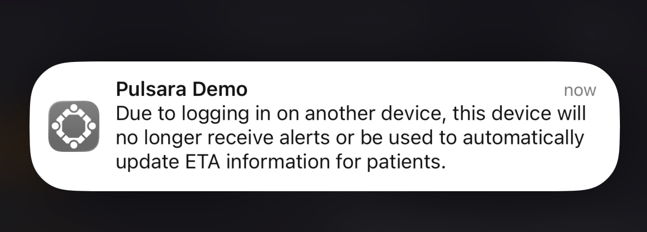 Pulsara only supports being logged into one Mobile device per user account at a time. Alerts and Auto-ETA will be used on the device that was last logged into.