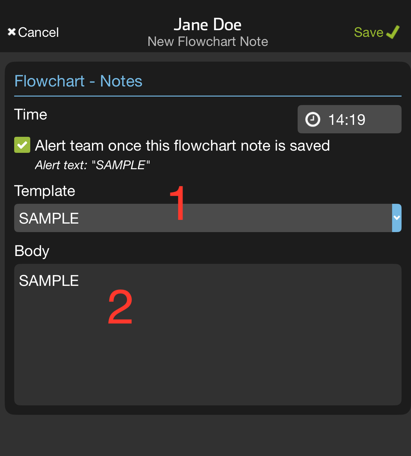 Optionally alert the care team once the Note is saved by selecting or deselecting the “Alert teams once this note is saved” checkbox. The checkbox may default to checked or unchecked based on the configuration of the selected template.