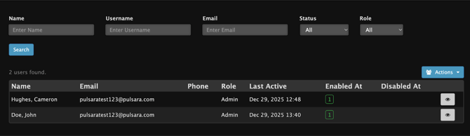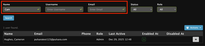 Users are able to be searched by Name, Username, or Email. Searching these fields will return any users whose Name, Username, or Email contains the search value.