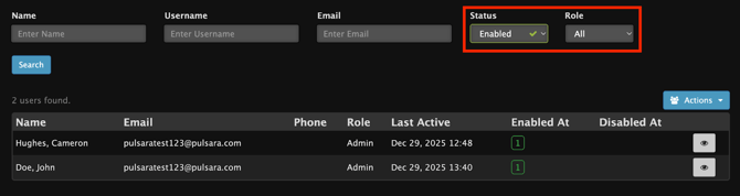 Users are able to be filtered by Status (All, Enabled, Disabled) and Role (All, Admin, or User).