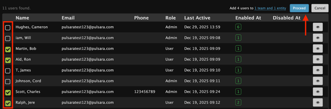 Check the box next to the users to add them to the desired Entity and team(s), then select Proceed.