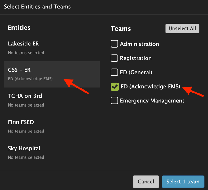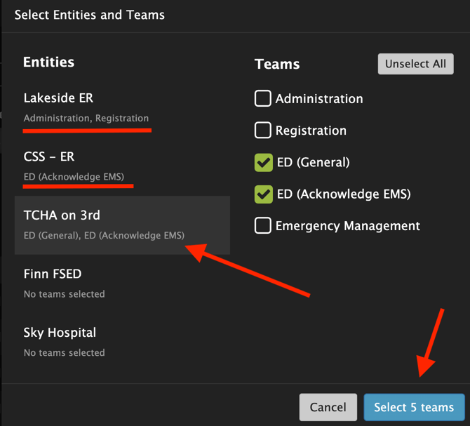 Note: Multiple entities and multiple teams can be selected. To view more than the entities that are displayed, scroll down the list of displayed entities.