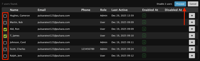 Check the box next to the users to disable them from the desired Entity, then select Proceed.