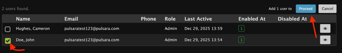 Check the box next to the users to enable them from the desired Entity, then select Proceed.